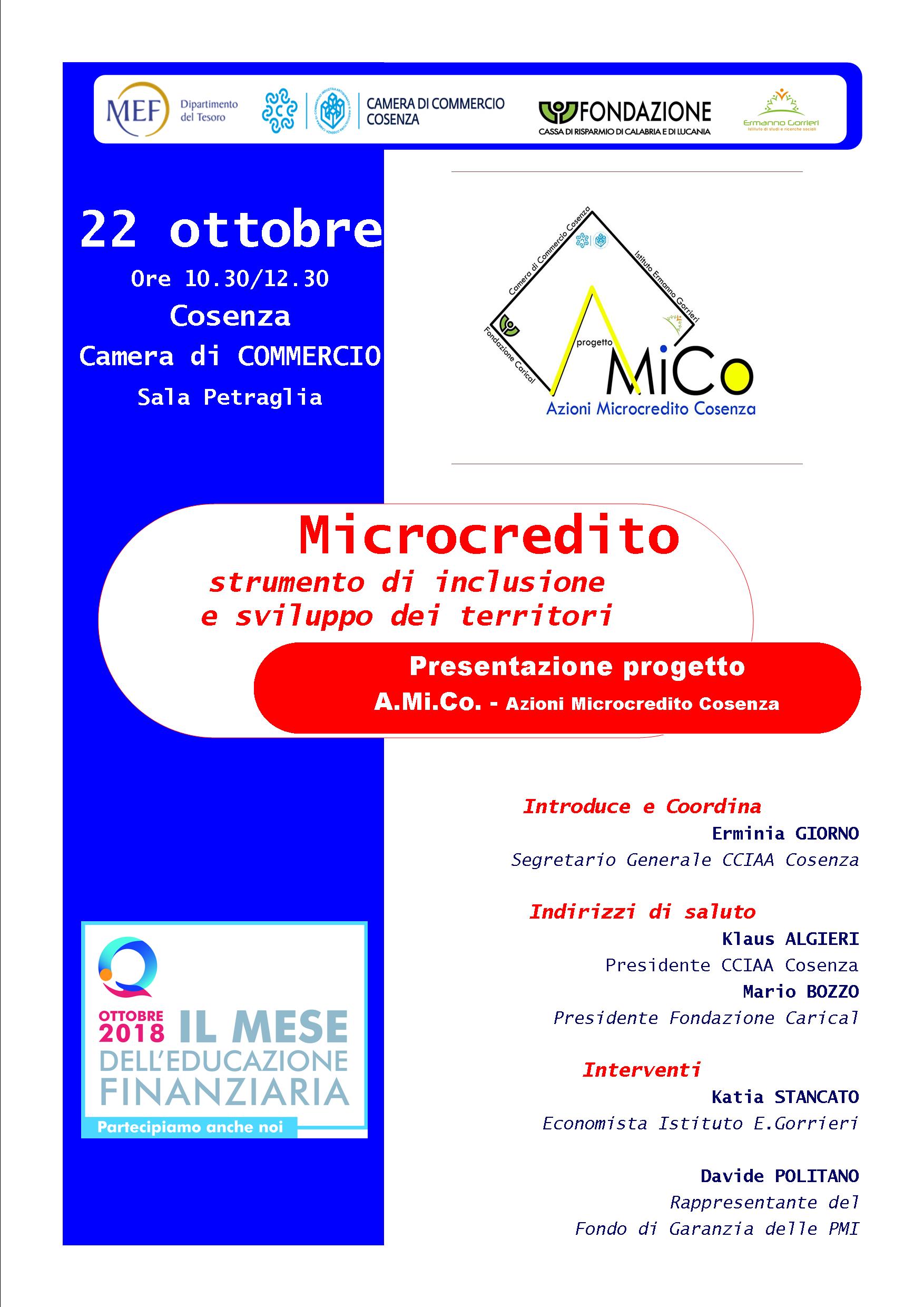 Lunedì 22 ottobre, a partire dalle ore 10.30, nella Sala Petraglia della Camera di Commercio di Cosenza (Via Calabria 33-Cosenza) verrà presentato il progetto A.Mi.Co-Azioni Microcredito Cosenza, che la Camera di Commercio realizzerà insieme alla Fondazione Cassa di Risparmio di Calabria e di Lucania e all'Istituto di studi e ricerche sociali "Ermanno Gorrieri".
