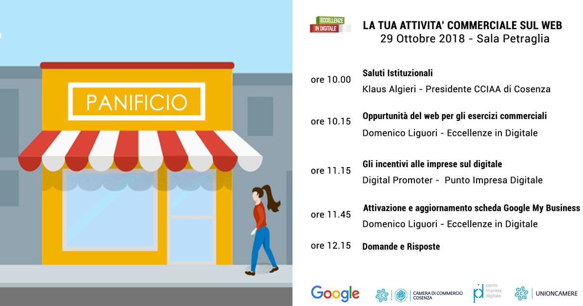 Il 29 Ottobre 2018 alle ore 10 presso la Sala Petraglia si terrà il primo incontro della nuova edizione dedicato alle piccole attività commerciali ed artigiane (negozi, bar, pizzerie, parrucchieri…) dal titolo “la tua attività commerciale sul web”.